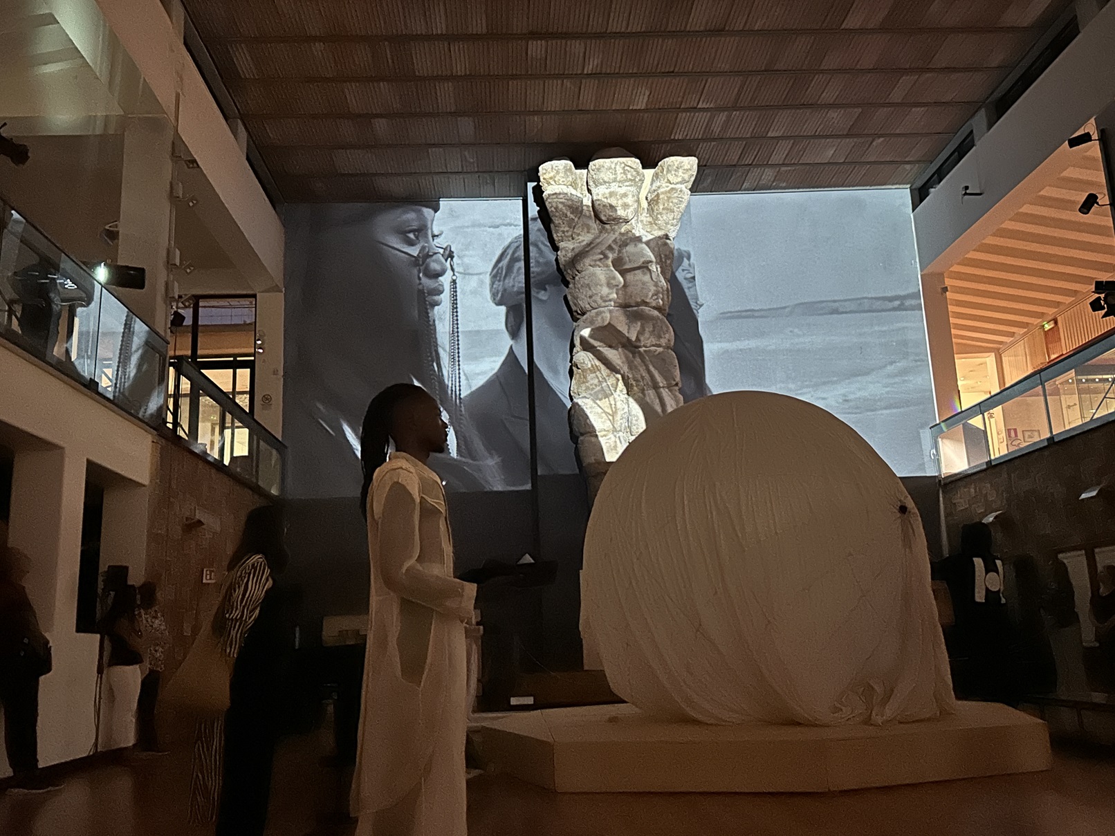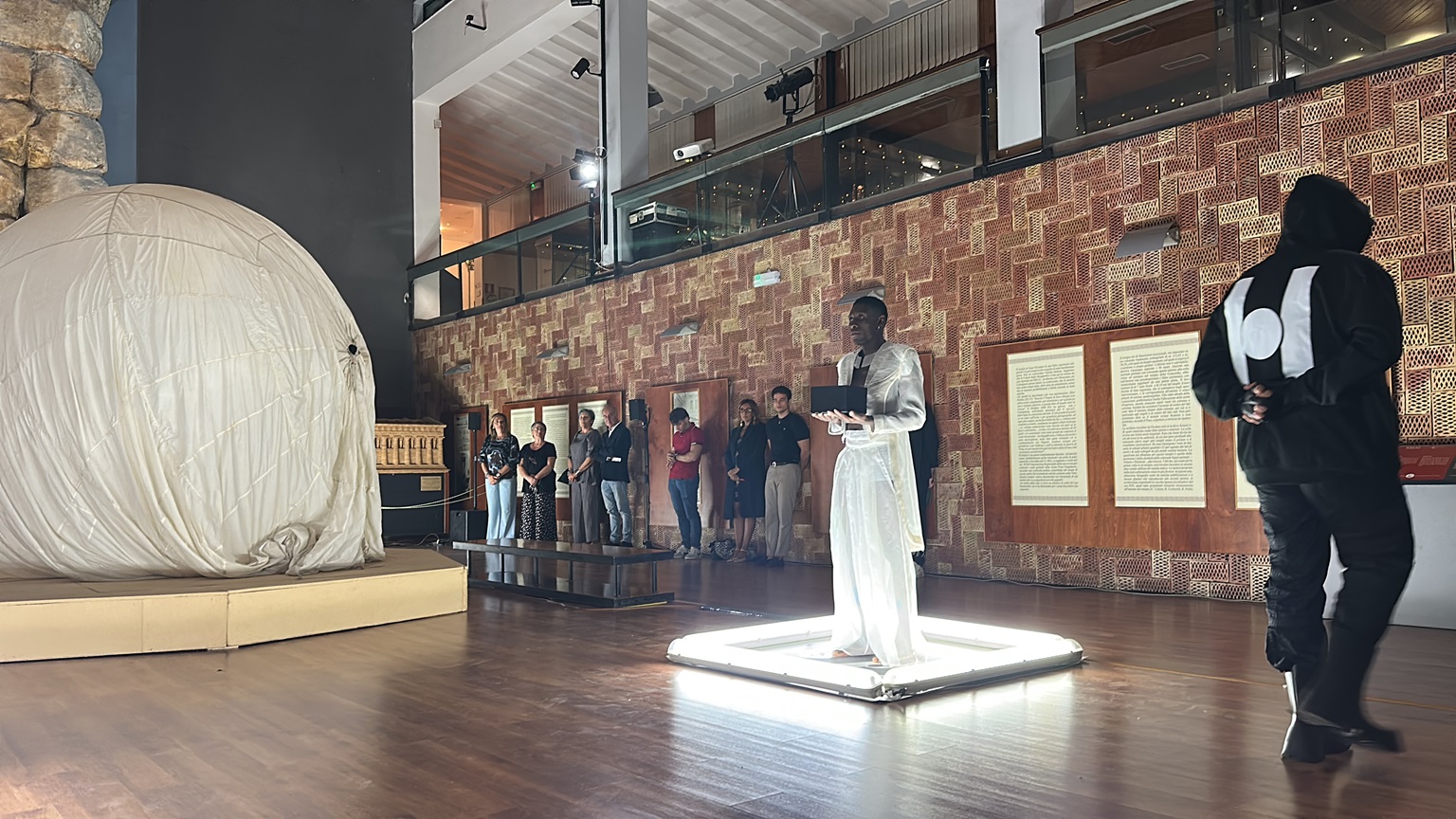 AGRIGENTO. Un offertorio laico di oggetti, simboli, immagini. La performance di Simone Valsecchi nella sala Zeus del museo archeologico Griffo, nella Valle dei Templi di Agrigento, ha coinvolto sei attori che hanno dialogato con il suo mondo visionario . Una grande bolla trasparente per un automa formale che reca morte e violenza e combatte la bellezza e la conoscenza. Ma ne resta vinto e traspira in una scultura vivente, sotto il Telamone che troneggia nella sala: ma la performance di Valsecchi – presentata la sera di giovedì 2 ottobre – non si esaurisce nello spazio della rappresentazione, piuttosto trova una nuova vita nel cosiddetto Museo della seconda scelta, ovvero i depositi del Museo che accolgono migliaia di reperti. Un luogo, la sala Francesco Sinatra, dove entrano di solito solo archeologi e studiosi, e che invece da mercoledì (8 ottobre) accoglieranno gli oggetti di scena di H I Am I, a partire dalla lunga veste nera coperta da 2654 conchiglie che Simone Valsecchi ha cucito personalmente, una per ciascun migrante scomparso in mare da gennaio a oggi. E ancora, altri oggetti, ognuno dal significato importante, in stretto dialogo con lo spazio, e con il tempo e il luogo attorno. Un’occasione unica, quella di H-I am I, per entrare in spazi di studio, dove ogni reperto pare aver trovato il suo posto.