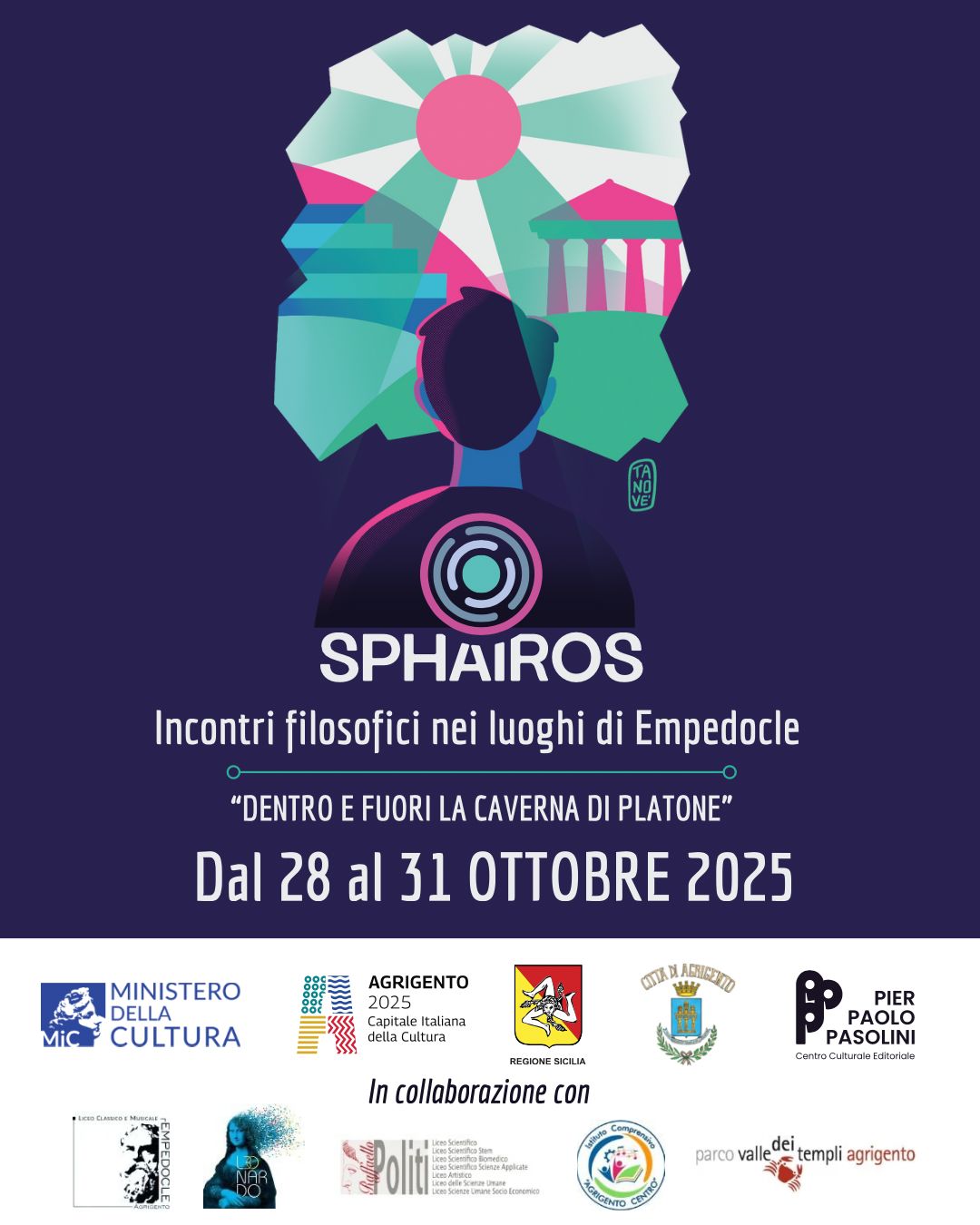 Dal 28 al 31 ottorenderà il via la prima edizione di “Sphairos – incontri filosofici nei luoghi di Empedocle”. L’evento, che è organizzato dal Centro culturale “Pier Paolo Pasolini” ed è finanziato dal Ministero della Cultura e dalla Fondazione Agrigento 2025, è parte del programma ufficiale di Agrigento Capitale italiana della Cultura e avrà come tema “Dentro e fuori dalla caverna di Platone”.