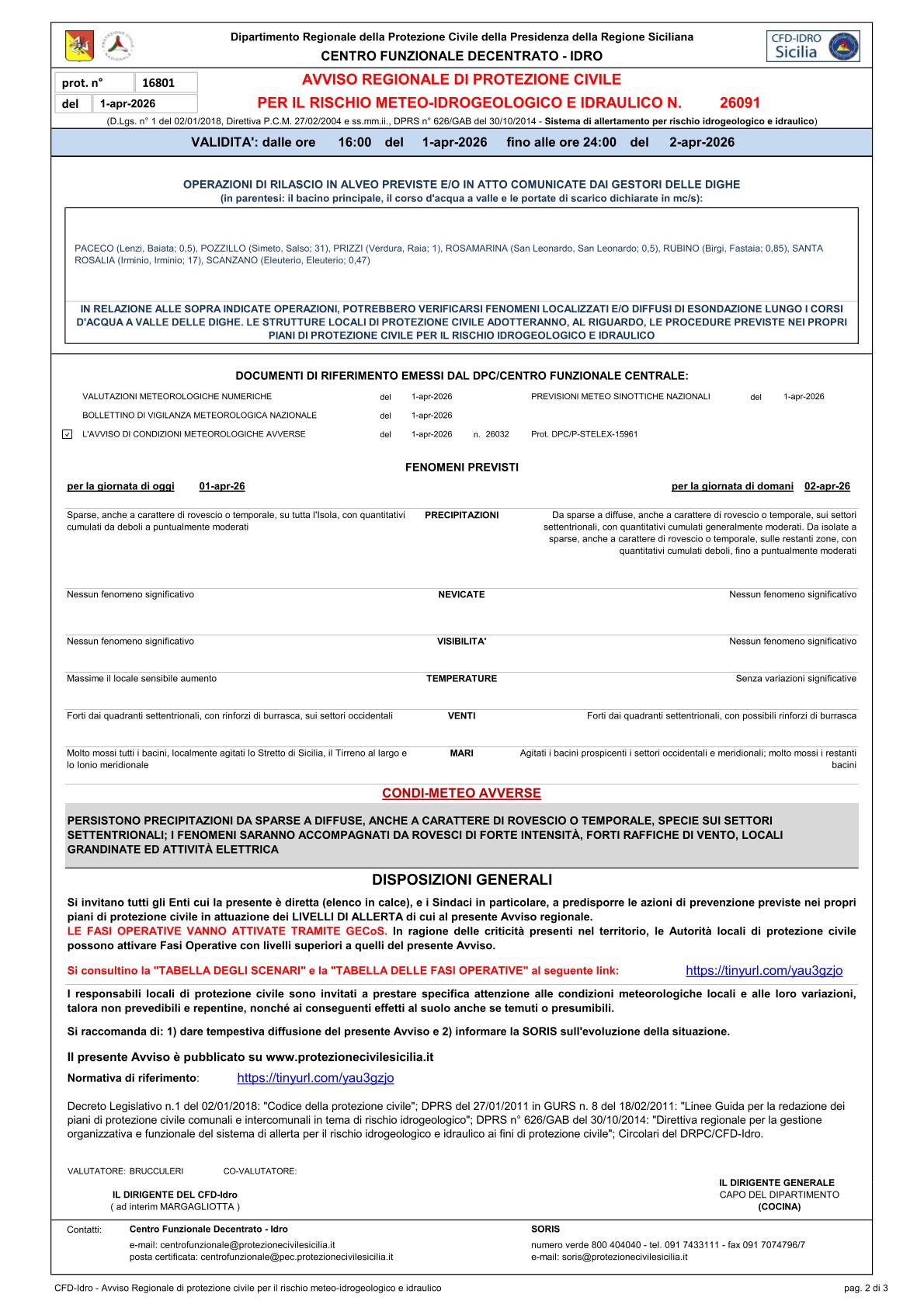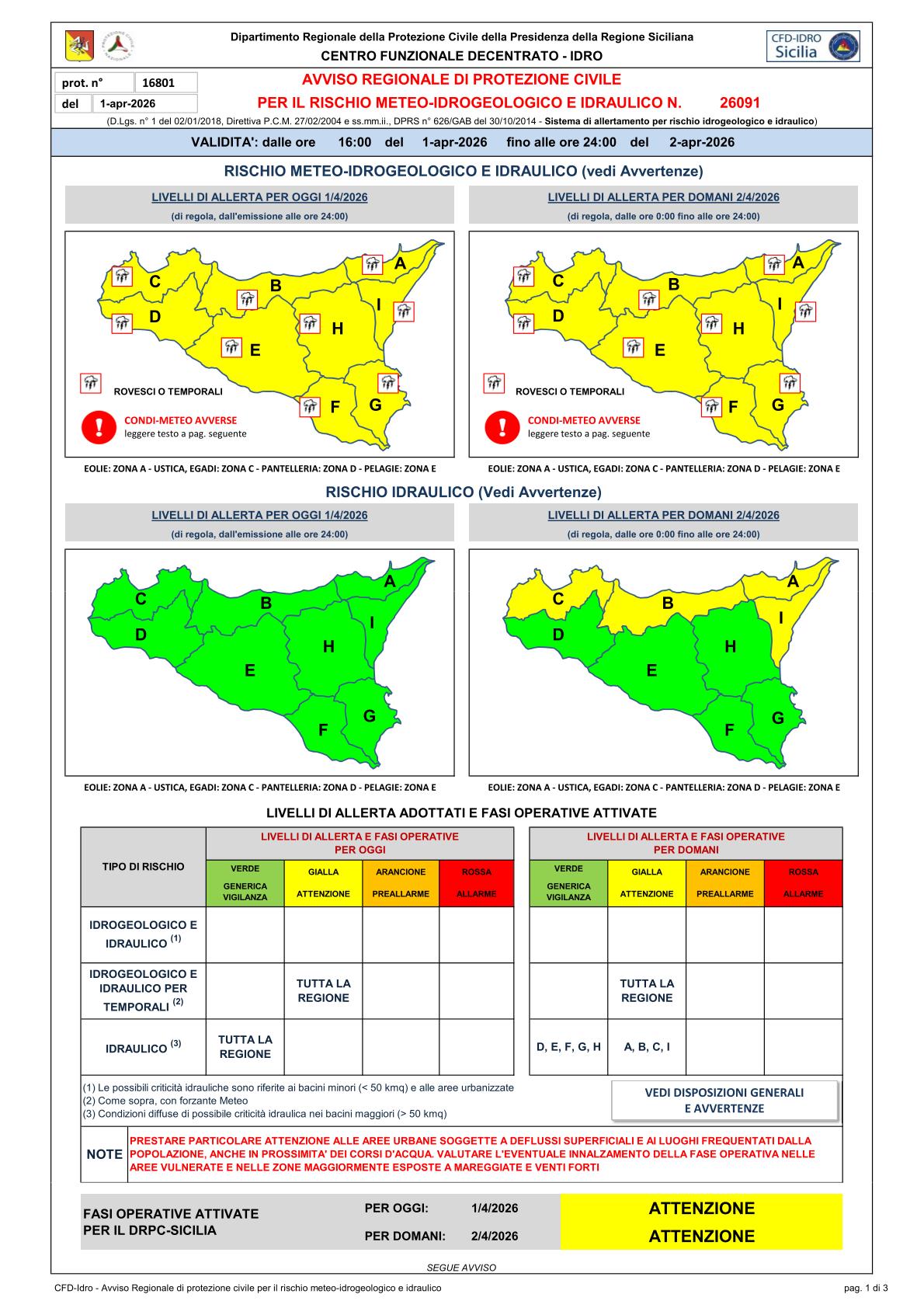 Il Sindaco avvisa la cittadinanza che il D.R.P.C. ha diramato AVVISO PER IL RISCHIO METEO-IDROGEOLOGICO ALLERTA GIALLA con CONDI-METEO AVVERSE N. 26091 del 01/04/2026 con validità dalle ore 16:00 del 01/04/2026 fino alle ore 24:00 del 02/04/2026