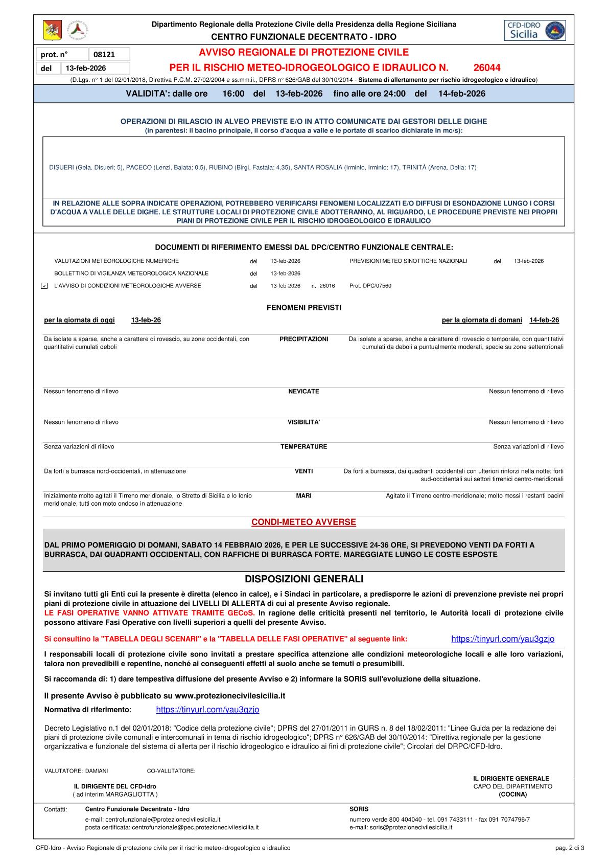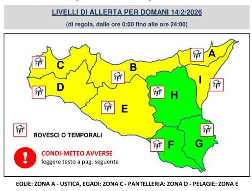 Il Sindaco avvisa la cittadinanza che il D.R.P.C. ha diramato AVVISO PER IL RISCHIO METEO-IDROGEOLOGICO ALLERTA GIALLA con CONDI-METEO AVVERSE N. 26044 del 13/02/2026 con validità dalle ore 16:00 del 13/02/2026 fino alle ore 24:00 del 14/02/2026
