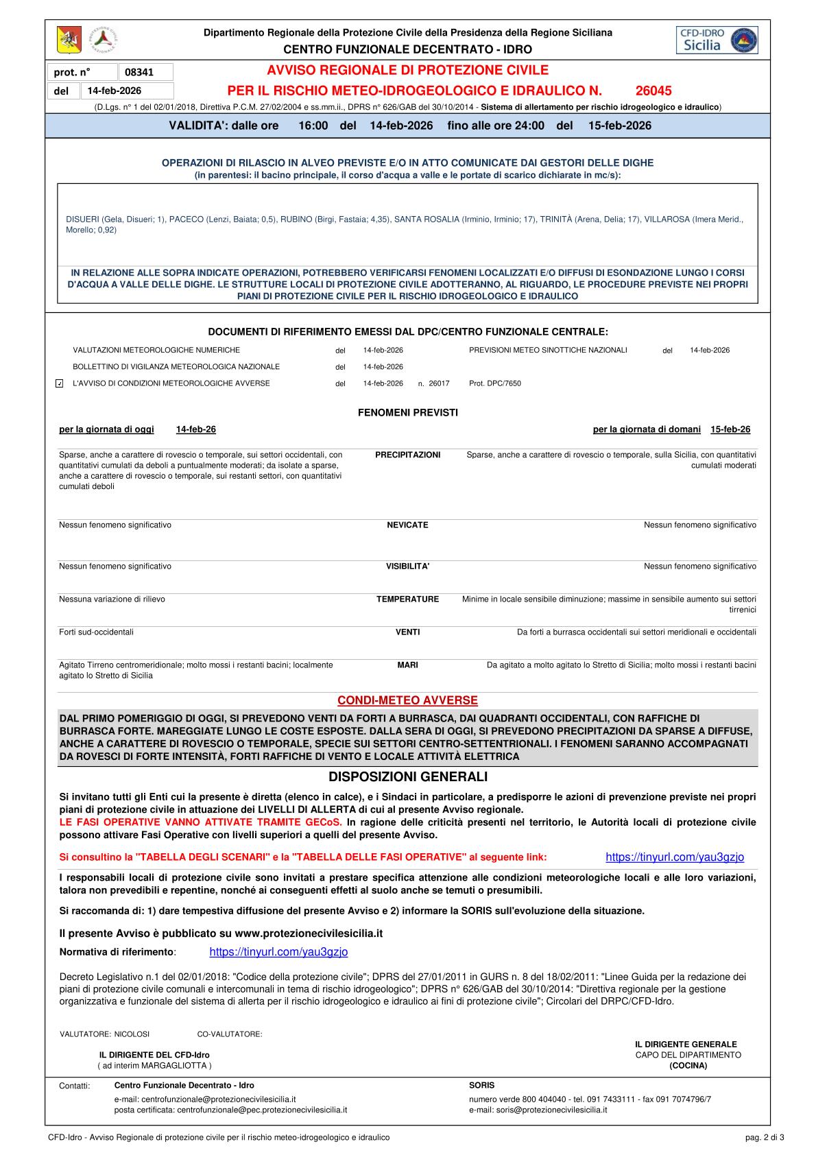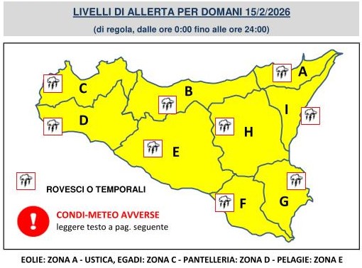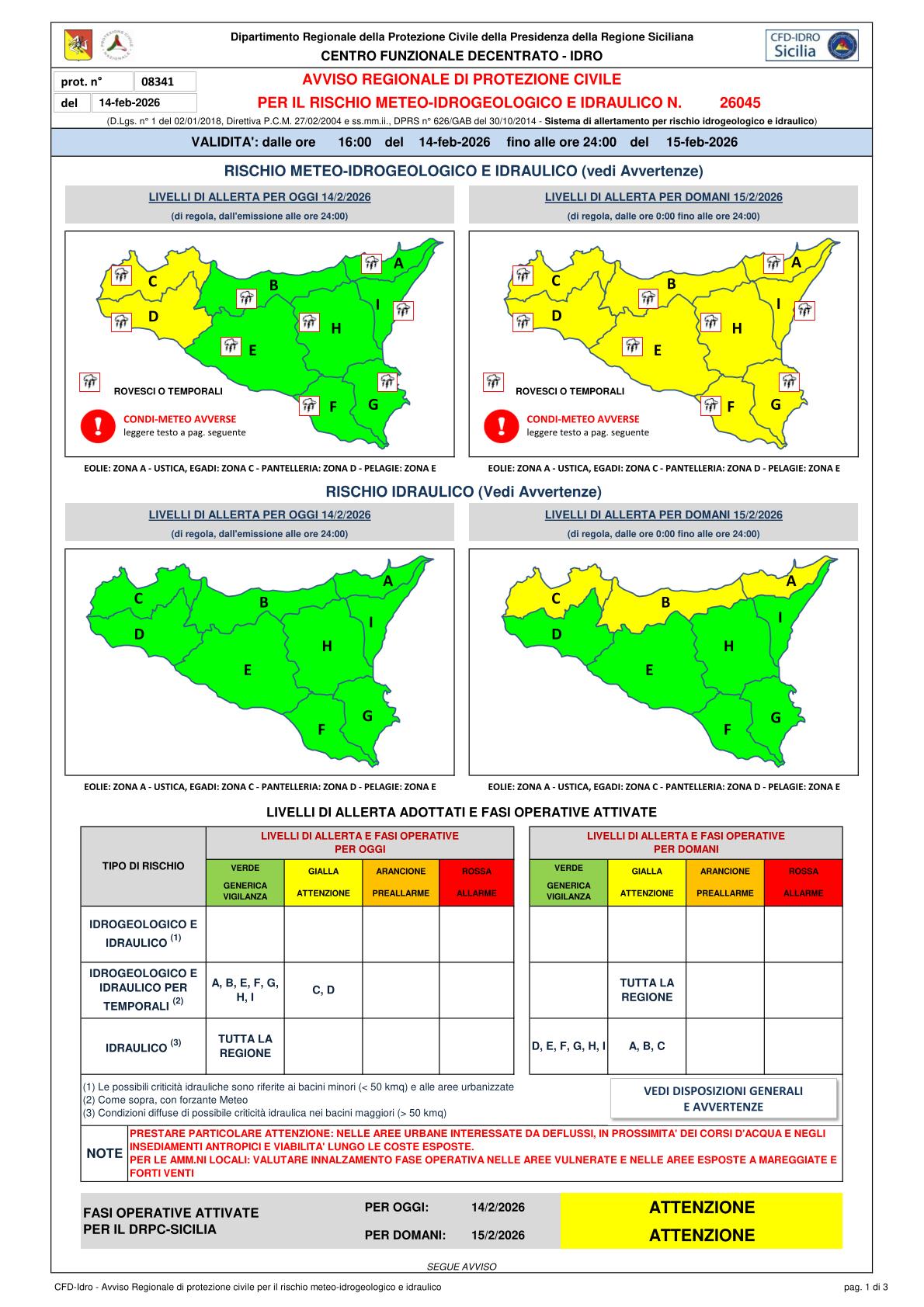 Il Sindaco avvisa la cittadinanza che il D.R.P.C. ha diramato AVVISO PER IL RISCHIO METEO-IDROGEOLOGICO ALLERTA GIALLA con CONDI-METEO AVVERSE N. 26045 del 14/02/2026 con validità dalle ore 16:00 del 14/02/2026 fino alle ore 24:00 del 15/02/2026