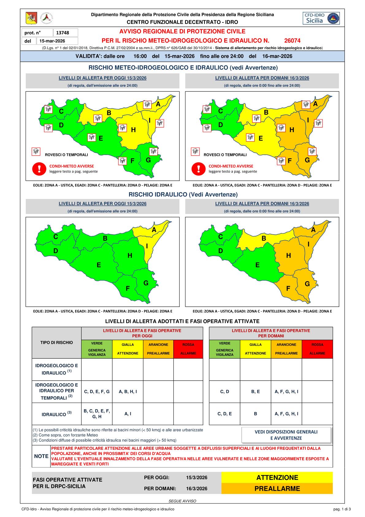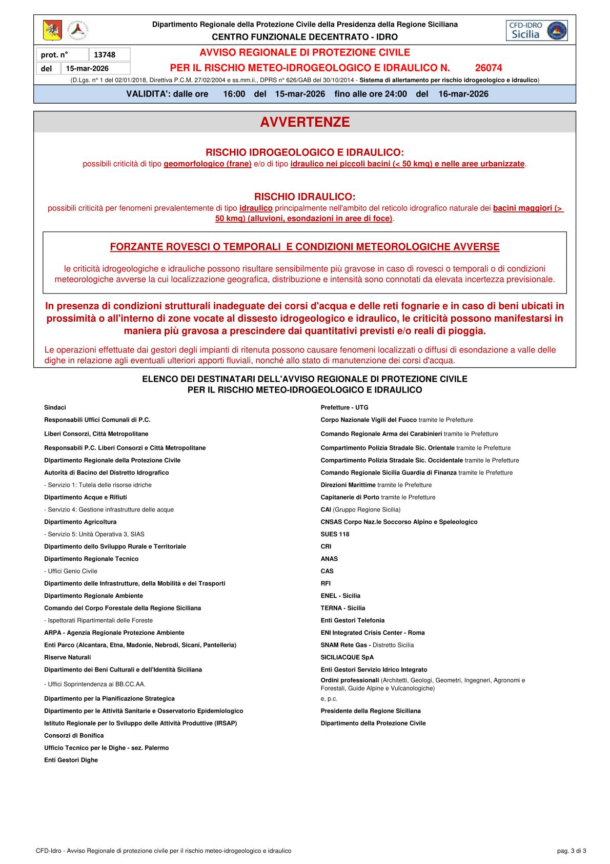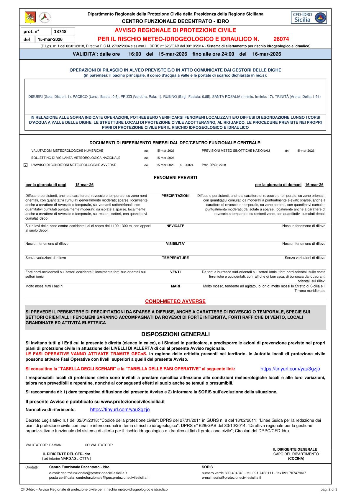 N. 26074 del 15/03/2026 con validità dalle ore 16:00 del 15/03/2026 fino alle ore 24:00 del 16/03/2026