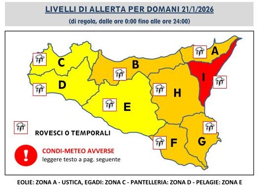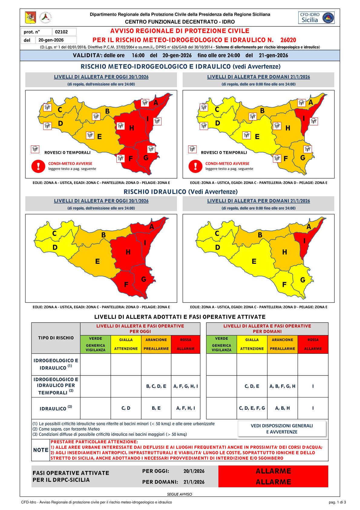 Il Dip.to Reg.le della Protezione Civile ha diramato il seguente AVVISO DI RISCHIO METEO-IDROGEOLOGICO E IDRAULICO n. 26020 del 20/01/2026, relativo alla zona “E”, valevole dalle ore 16,00 del 20/01/2026 fino alle ore 24,00 del 21/01/2026; conferma il livello di allerta METEO-IDROGEOlOGICO e IDRAULICO “ARANCIONE” con fase operativa di “PREALLARME” con rovesci o temporali dalle ore 16,00 alle ore 24,00 del 20/01/2026, mentre dalle ore 0,00 alle ore 24,00 del 21/01/2026 il livello è “GIALLO” con fase operativa di “ATTENZIONE” con rovesci o temporali.
