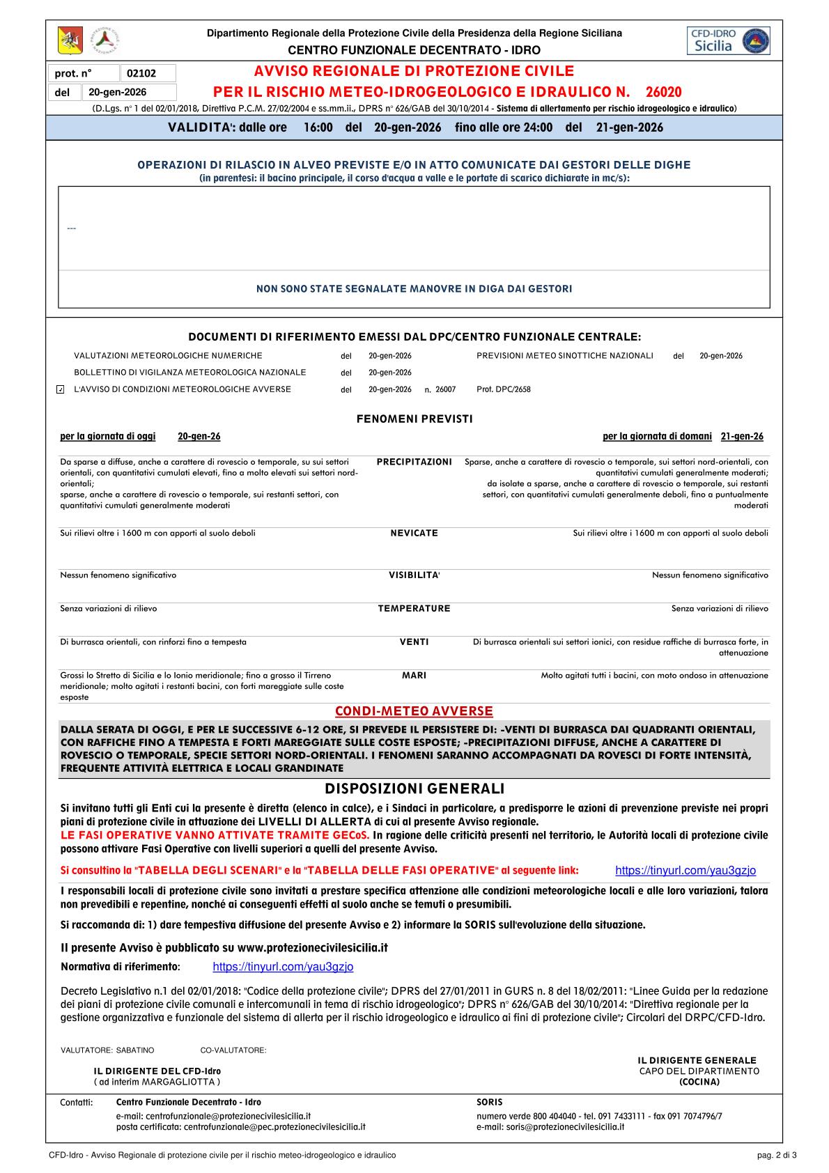 Allerta meteo 20 Gennaio 2026 n. 26020 (gialla)
