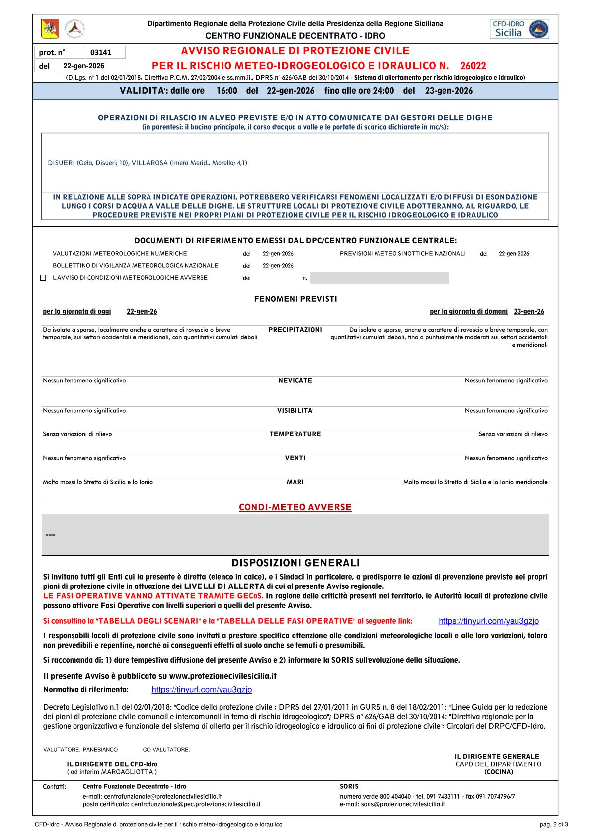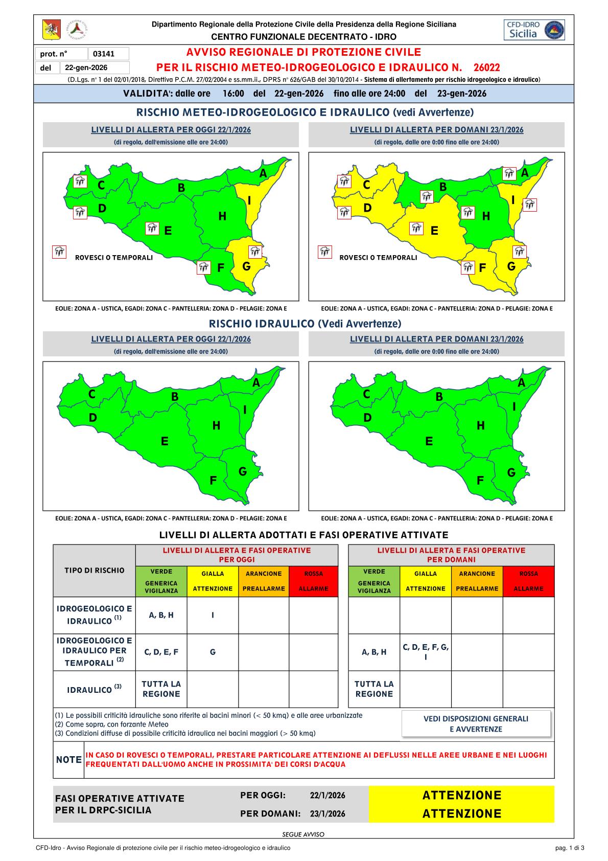 Allerta meteo 22 Gennaio 2026 n. 26022 (gialla)