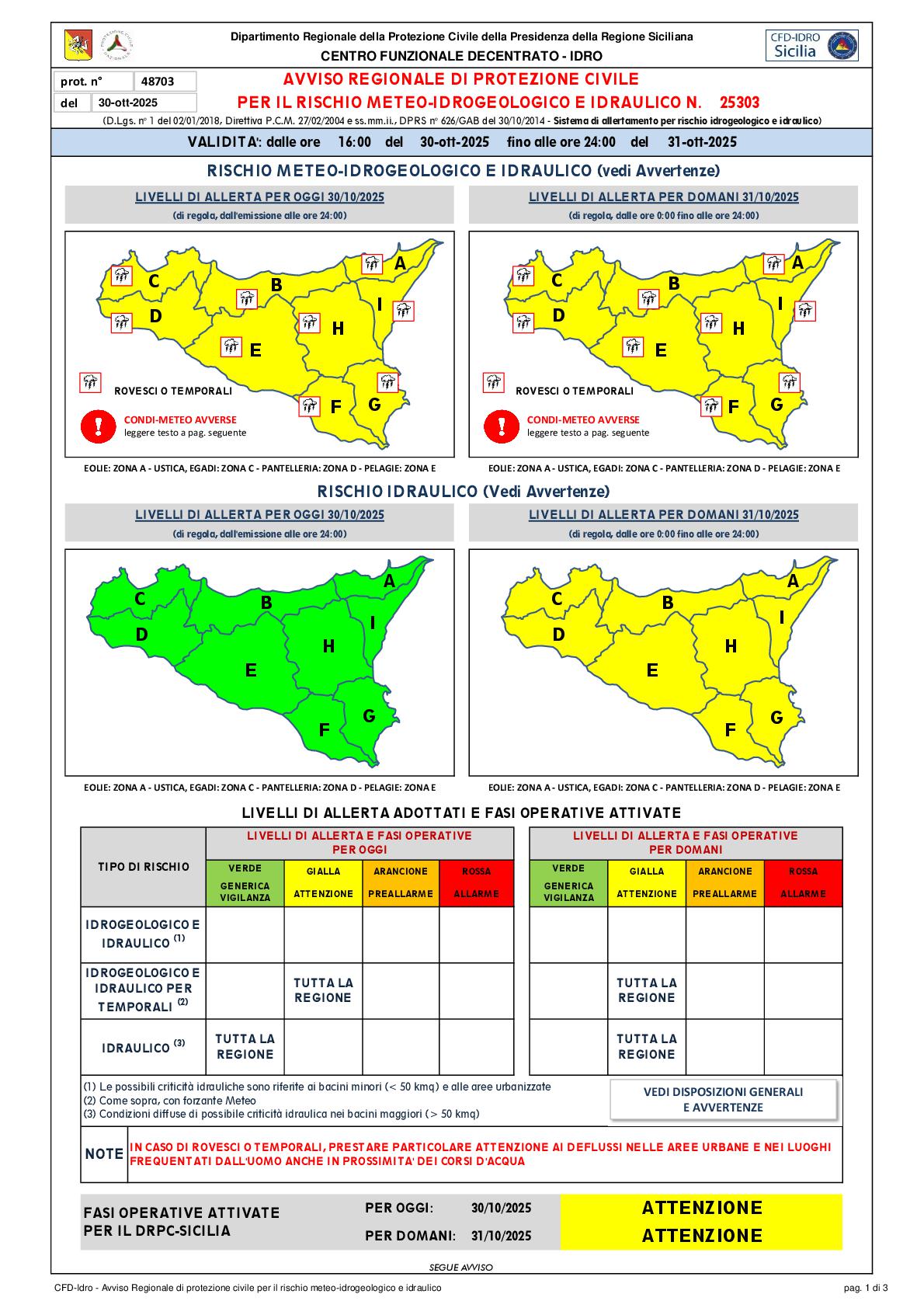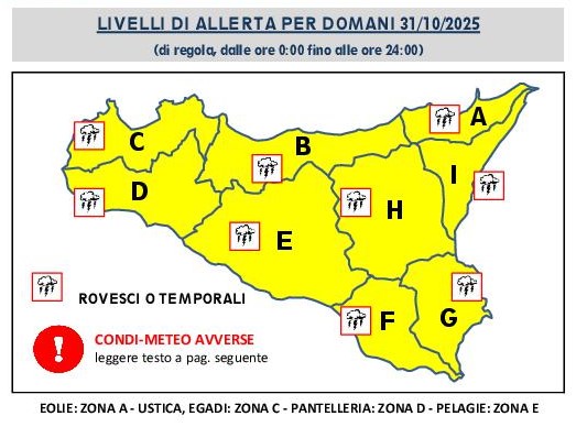 Il Sindaco avvisa la cittadinanza che il D.R.P.C. ha diramato  AVVISO PER IL RISCHIO METEO-IDROGEOLOGICO ALLERTA GIALLA con CONDI-METEO AVVERSE N. 25303 del 30/10/2025 con validità dalle ore 00:00 fino alle ore 24:00 del 31/10/2025