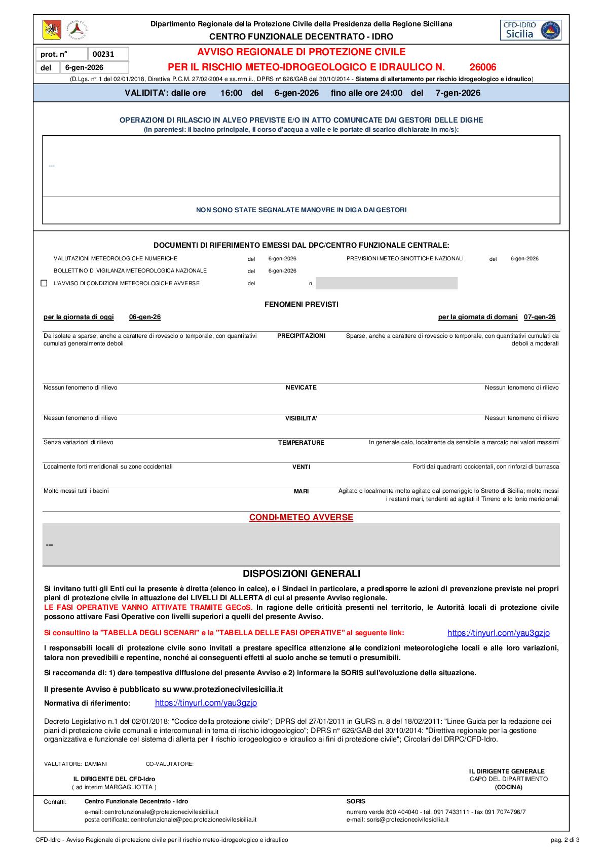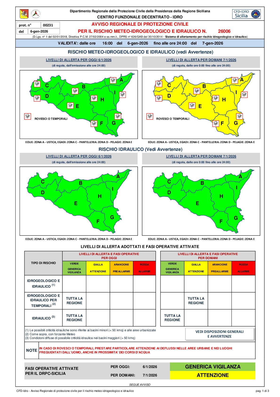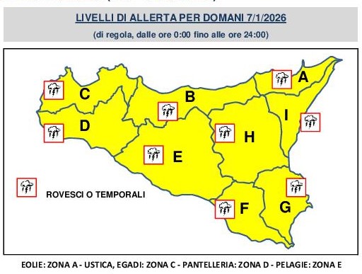 Il Sindaco avvisa la cittadinanza che il D.R.P.C. ha diramato AVVISO PER IL RISCHIO METEO-IDROGEOLOGICO ALLERTA GIALLA con rovesci o temporali N. 26006 del 06/01/2026 con validità dalle ore 0:00 fino alle ore 24:00 del 07/01/2026