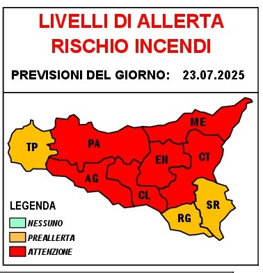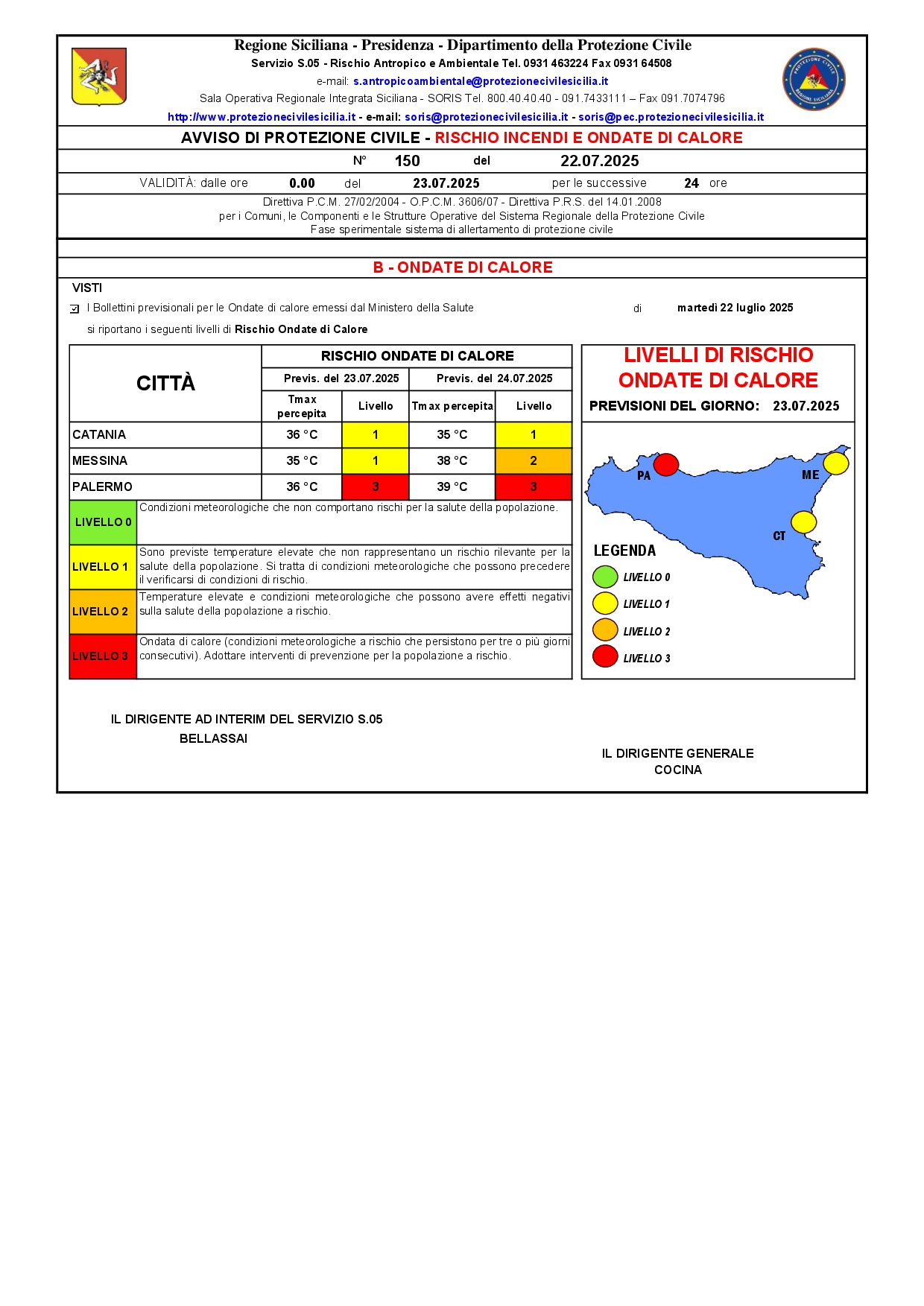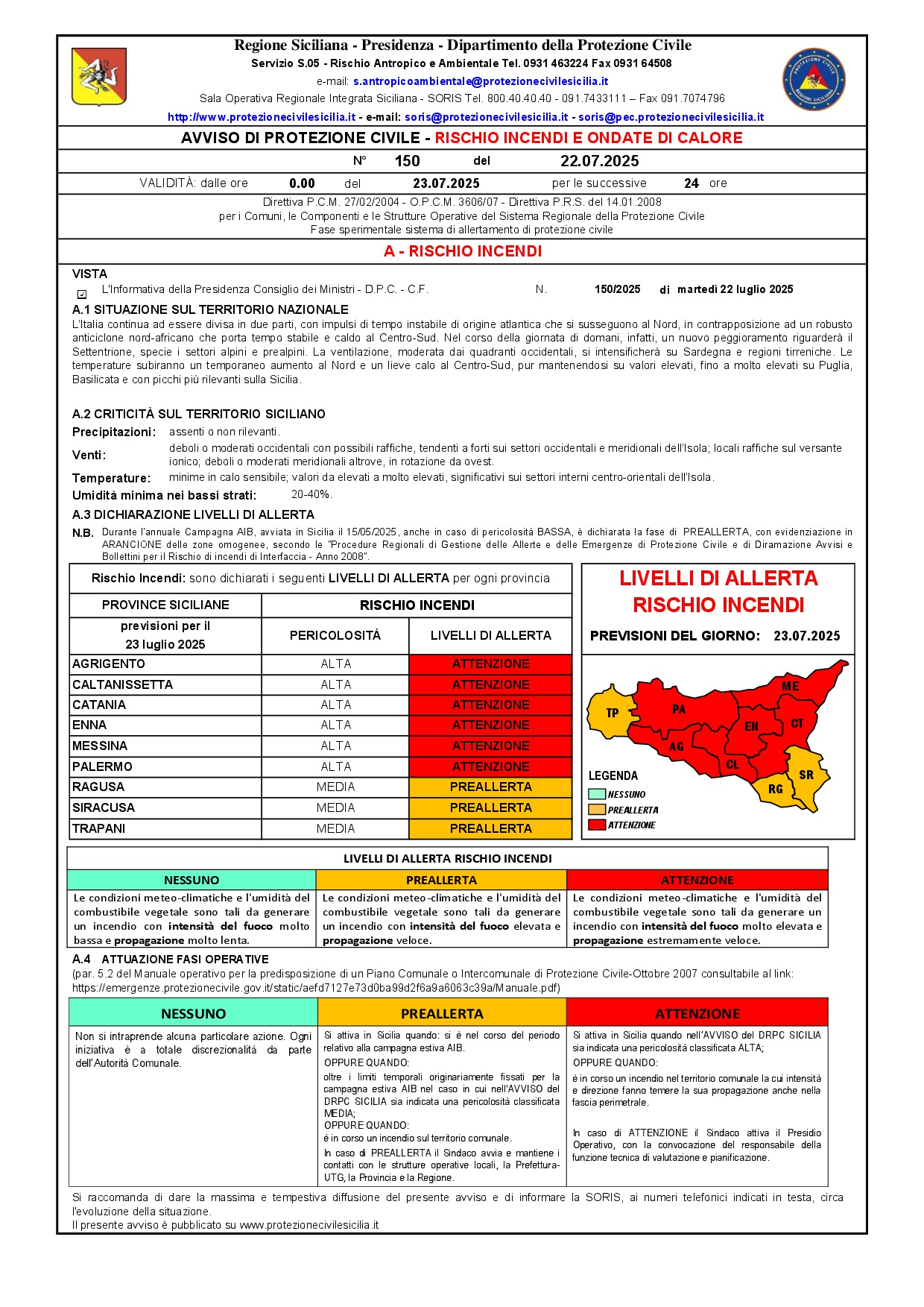 Il Dip.to Reg.le della Protezione Civile ha diramato l’AVVISO Regionale n. 150 del 22/07/2025 per RISCHIO INCENDI E ONDATE DI CALORE valido dalle ore 00:00 del 23/07/2025 per le successive 24 ore.