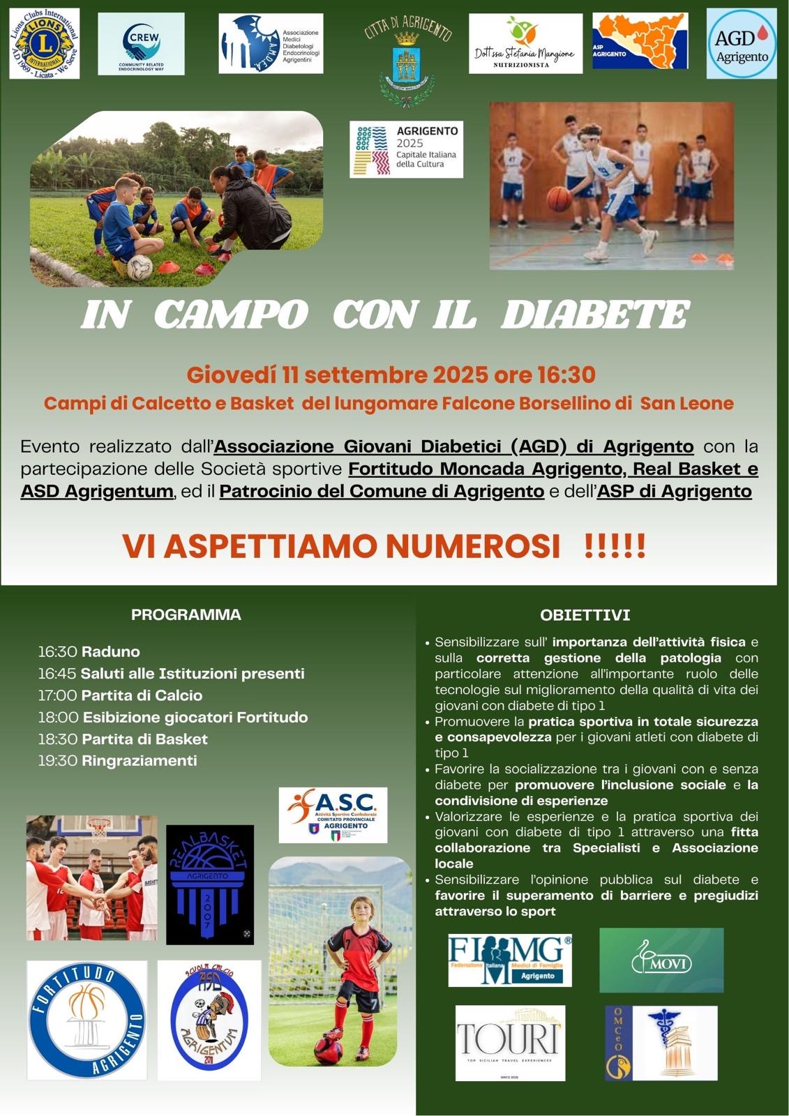 L’iniziativa, ideata e promossa dai diabetologi e pediatri dell’Asp di Agrigento e dall’Associazione Giovani Diabetici, con il patrocinio del Comune di Agrigento, della Federazione Italiana Medici di Famiglia di Agrigento, dell’Ordine dei Medici di Agrigento, intende promuovere l’integrazione nell’ambito delle attività sportive a qualsiasi livello dei giovani