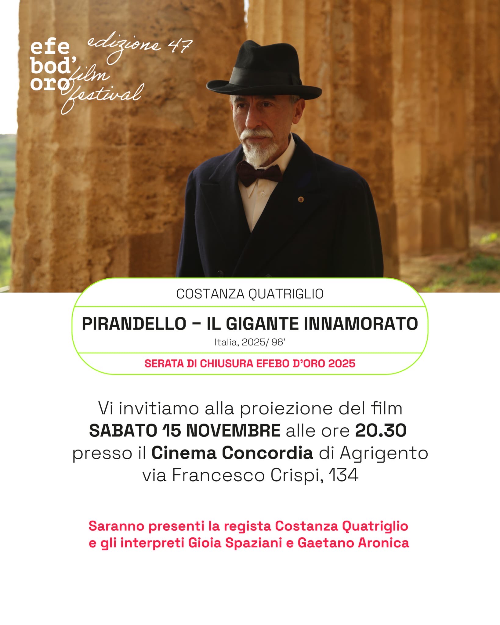 A seguire, dopo il successo riscosso alla Festa del Cinema di Roma, sarà proiettata l’anteprima siciliana di “Pirandello – Il gigante innamorato” (2025), docufiction di Costanza Quatriglio, realizzata in occasione del 90esimo anniversario della morte di Luigi Pirandello. Oltre alla regista Quatriglio, in sala saranno presenti anche l’attrice Gioia Spaziani e l’attore agrigentino Gaetano Aronica, che nel film interpreta proprio Luigi Pirandello. Ingresso libero fino ad esaurimento dei posti.